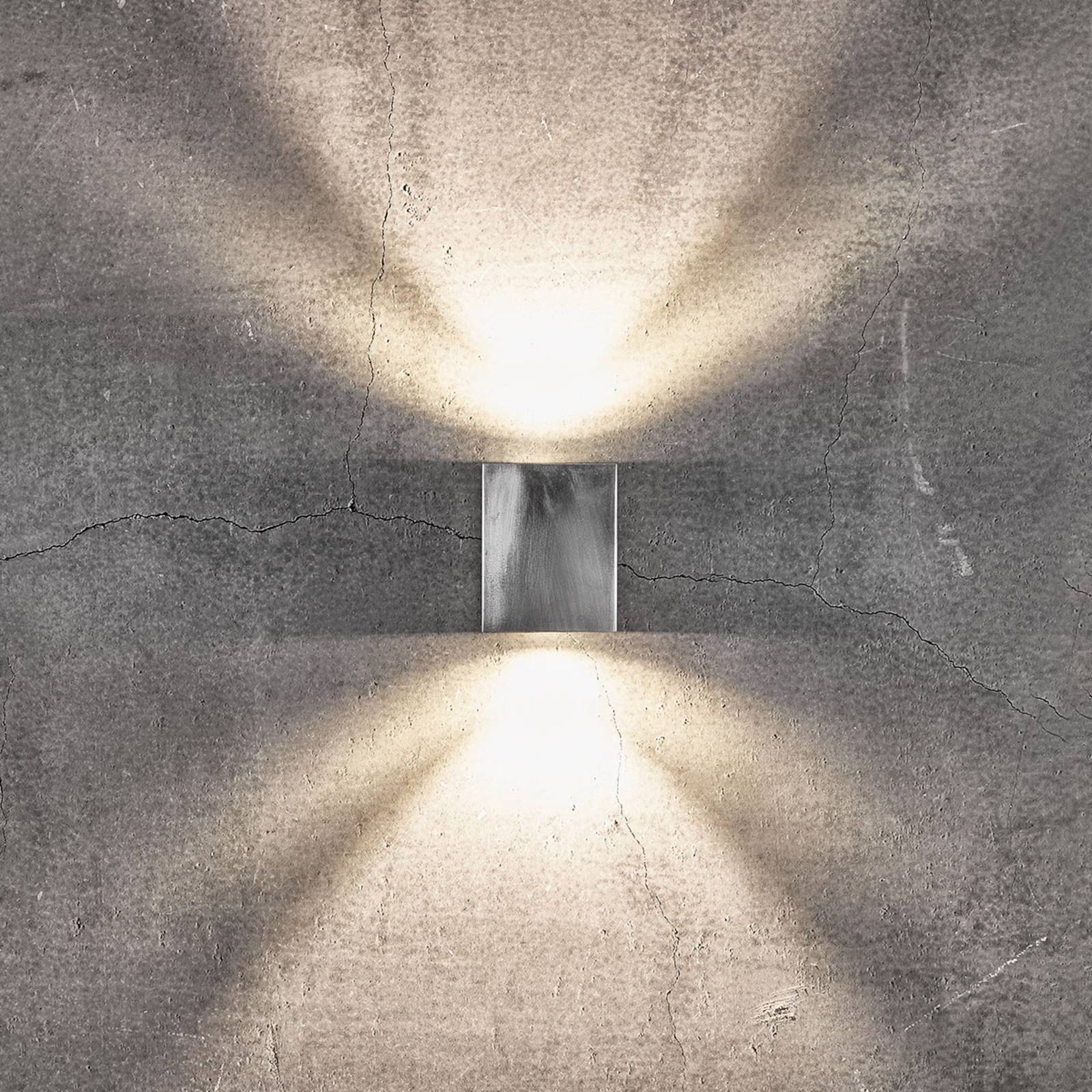 LED-buitenwandlamp Canto Kubi 2 in vierkant design Met zijn vormgeving als een vierkante, staande kubus heeft deze buitenmuurarmatuur een eenvoudige en moderne designtaal. De LED’s van Canto Kubi 2 bevinden zich achter ronde afdekkingen in de vorm van helder glas aan de boven- en onderkant, waardoor het warme witte licht onder een hoek van 120° naar buiten wordt uitgestraald. Het resultaat is een op en neergaande verlichting met een enkele stralingshoek; decoratieve lichtaccenten kunnen worden bereikt met behulp van de bij de levering inbegrepen sjablonen. Canti Kubi 2 is gemaakt van spuitgegoten aluminium op een eigentijdse manier. – meerdere armaturen kunnen parallel worden aangesloten